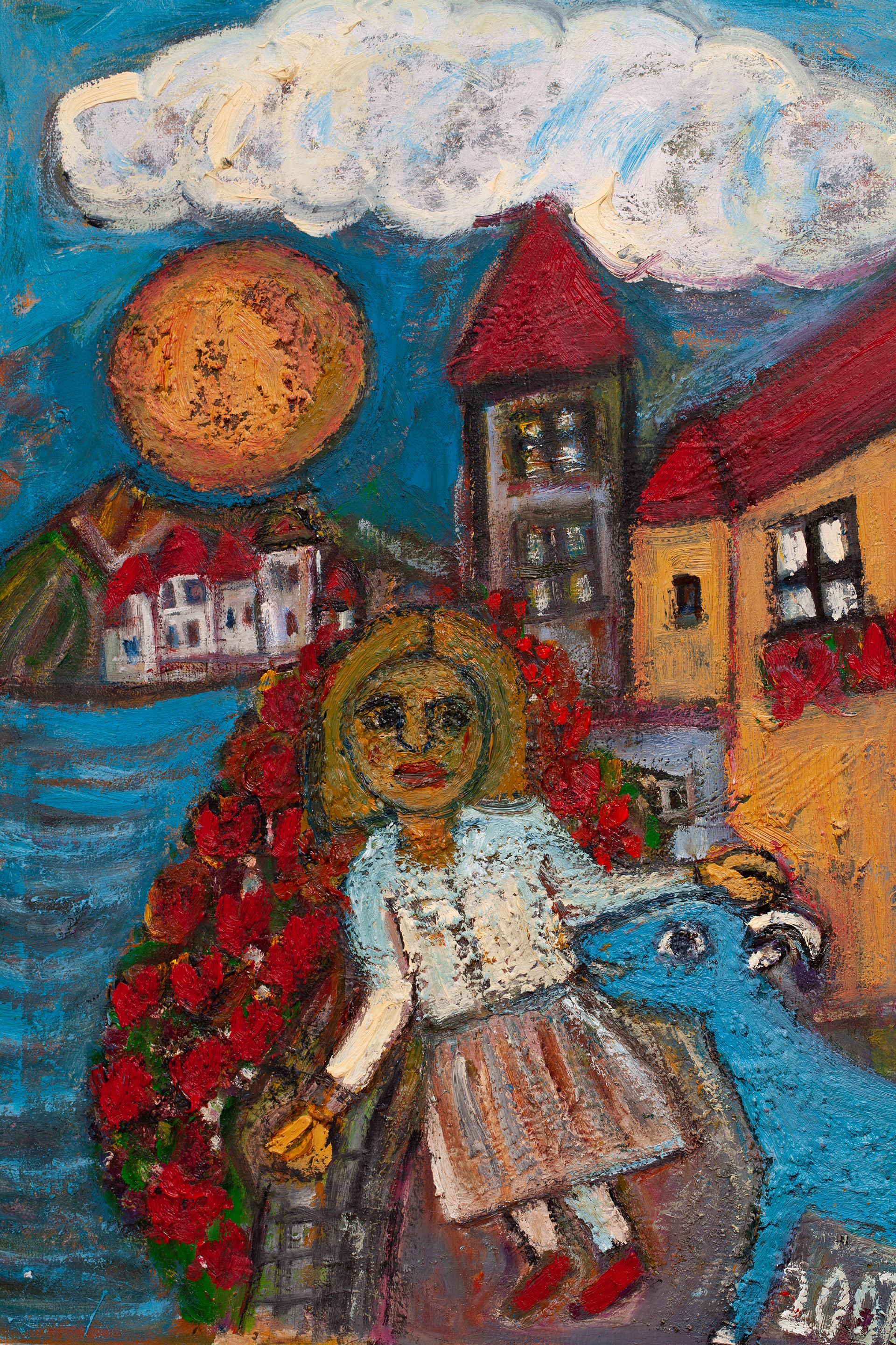 Girl, blue goat and red flowers